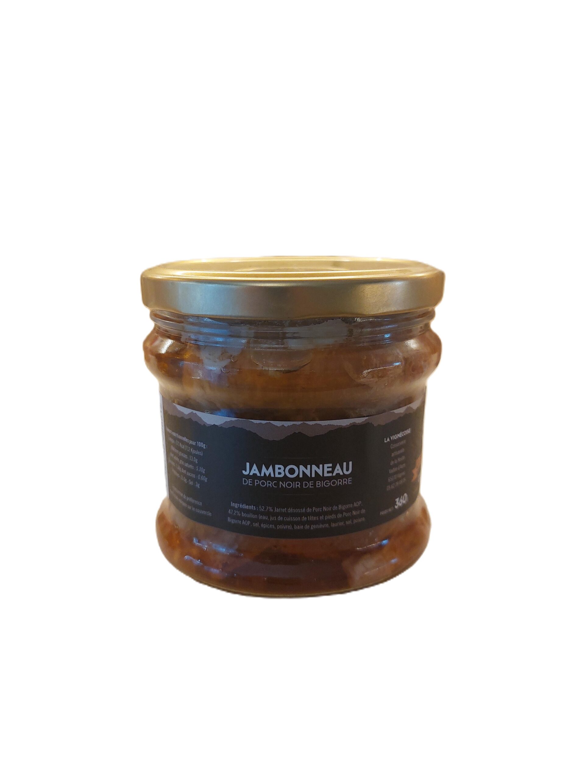 Jambonneau de Porc noir de Bigorre AOP lentement cuit, effiloché et mis en bocal dans sa gelée naturelle parfumée. Texture fondante, goût authentique et conservation optimale. A déguster avec du pain, cornichons ou en entrée.