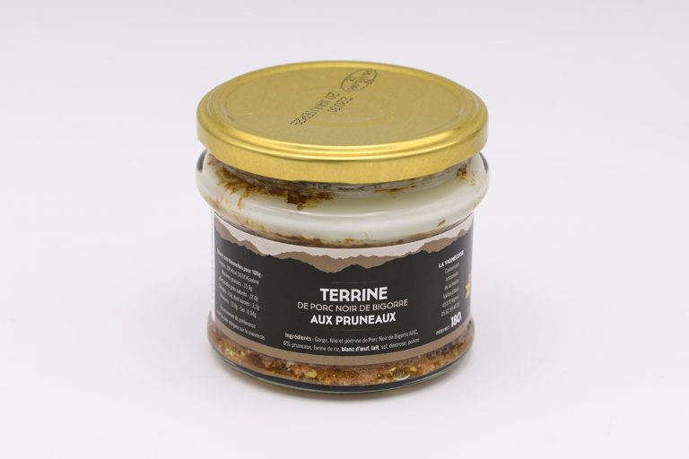 Gorge, foie et poitrine de Porc Noir de Bigorre AOP, 6% pruneaux, farine de riz, blanc d’œuf, lait, sel, poivre.